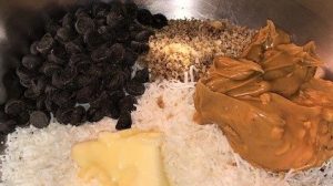 - Mix the peanut butter, softened butter, pecans, coconut and chocolate chips in a medium bowl.